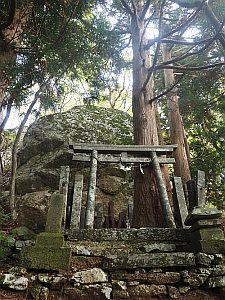 山頂近くの大岩に、神剣数本が立てかけられていた。