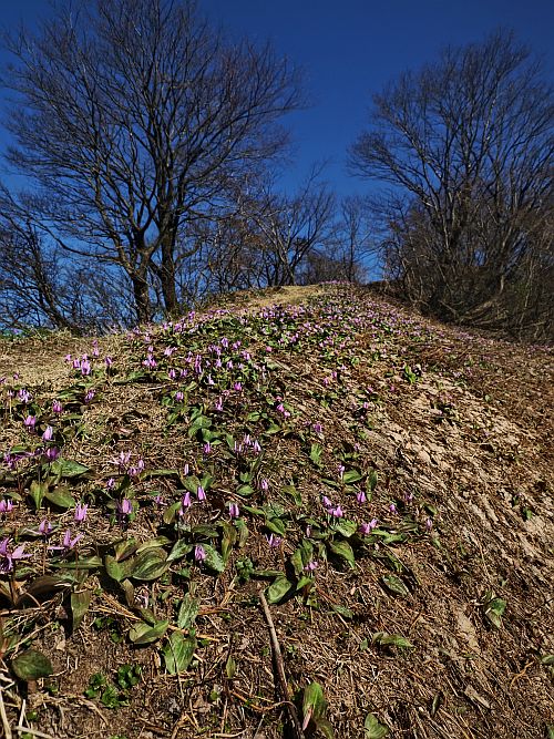 カタクリが盛りで、登山道はパープルラインだった。