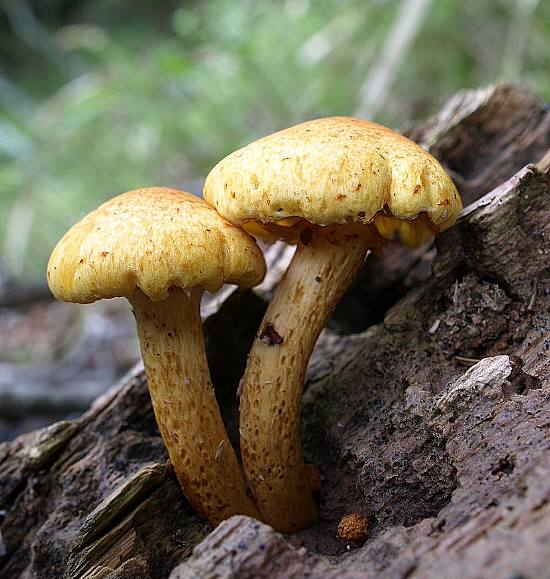 全体に黄褐色で、細かなささくれに覆われる。 柄の上部に濃褐色繊維状のツバの残片が付着する。