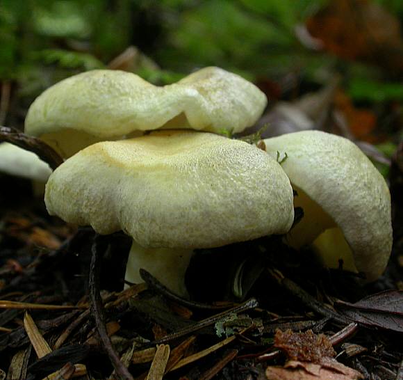 若い個体のカサは、地色が灰色で周縁部に薄い紫のぼかし状の模様が入りますが、成熟すると写真のようなレモンイエローになります。 管孔はニンギョウタケモドキと同様、細かい。